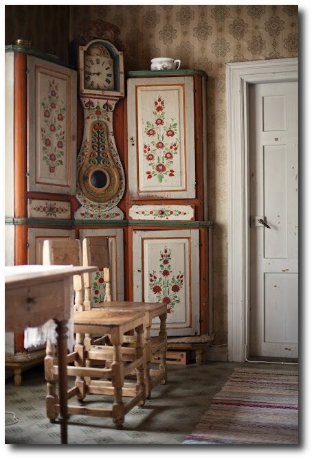 Белые стены, лаконичный дизайн - так большинство представляет скандинавский дизайн и шведский в частности. Создается ощущение, что до начала XX века никакого дизайна не существовало. На самом деле шведский дизайн проходил через те же этапы развития, что и европейская часть, чаще всего неидеально подражая французским образцам. Благодаря тому, что Густав III оценил французский неоклассицизм и привез его в родную Швецию, один из "неидеально" повторенных стилей стал практически символом шведского дизайна. Отсутствие возможности использовать ценные материалы привело к тому, что дорогая отделка заменялась схожей по форме, но доступной. Ремесленники могли проявить свое мастерство, увидев интересные образцы для подражания. В сохранившихся домах (а их довольно много) можно увидеть работы шведских мастеров с явно выраженным национальным колоритом. Там, где сохранились оригинальная мебель и декор, рассматривать предметы - огромное удовольствие. И чем дальше от столицы, тем больше могли прояви