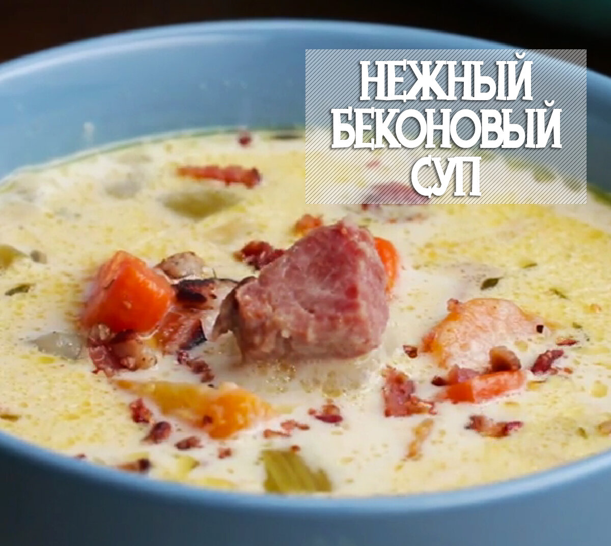 Суп - очень вкусное и полезное блюдо, но зачастую его лень готовить. Всем привет! С Вами Гурман, и сегодня я покажу как сделать великолепный нежный суп с беконом, приготовленный исключительно в сковороде😉 Ингредиенты 🔻 2 полоски бекона 🔻 1 большая луковица 🔻 1 стакан сельдерея 🔻 1 стакан моркови 🔻 3 столовые ложки муки 🔻 2 стакана ветчины (нерезаной кубиками среднего размера) 🔻 2 средние картофелины 🔻 свежий тимьян 🔻 1 чайная ложка черного перца (молотого) 🔻 6 стаканов куриного бульона 🔻 2 лавровых листочка 🔻 2 стакана сливок Приготовление 1. Полоски бекона режем на кусочки по пару сантиметров, и обжариваем на сухой сковороде. 2. Когда из бекончика вытопился жир, засыпаем порезанный мелкими кубиками лук, обжариваем до лёгкой золотистости. 3. Добавляем нарезанный сельдерей и морковь, немного обжариваем, после чего засыпаем муку. *На начале каждого этапа хорошенько перемешиваем. 4. Немного обжарив всё с мукой, добавляем картошку (нарезанную кубиками), ветчину, листочки свеже
