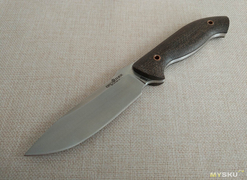 После невнятной модели F001, этот нож производит весьма неплохое впечатление. Достоинства все те же. Пухлая рукоять из микарты, ножны из кайдекса с креплением Тек-Лок… Вот только клинок в отличие от первой модели получился длинным и резучим. Подробности в обзоре. Нож сейчас существенно подешевел. Когда я брал его, стоил 28 баксов. Вот так выглядит нож в ножнах. Вид, скажем так, винтажный. Рукоять напоминает советский коричневый текстолит. А использование одновременно медной и латунной фурнитуры — это фирменный стиль Brothers. Длина всей конструкции 250 мм. Толщина с креплением 24,5 мм. Ножны изготовлены из кайлекса. Верхняя часть отформована по рукоятке ножа. У модели F001 ножны охватывали чуть ли не половину рукояти, у второй модели наоборот, область захвата неожиданно короткая. ► Расширенная версия обзора доступна на сайте MYSKU.ru Мне кажется у фирмы Brother свой стиль – они делают нарочитую полукустарщину. Если вам нужны вылизанные до мелочи технологичные изделия, посмотрите лу