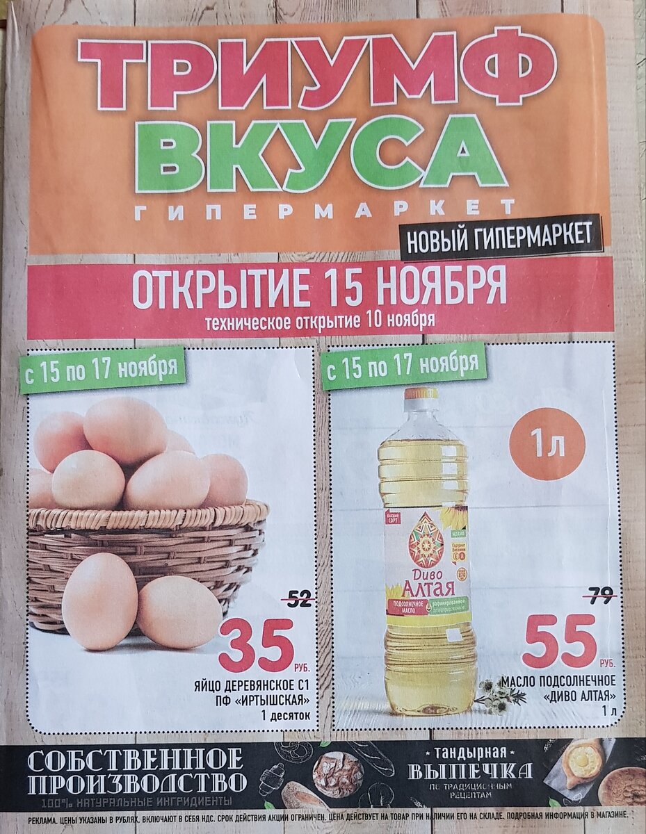 Открылся новый магазин Триумф. Заглянула за раскладкой по акциям. ОТКРЫЛСЯ 15 НОЯБРЯ. Магазин новый красивый, все выставлено на прилавках, что приятно для глаза. Нет конечно фото, телефон сел((( Взяла рекламную брошюру по ней и пробежимся. Яйца за 35 рублей. Очень демократичннаядемократичнная цена, можно прикупить и поставить в прохладное место. А вот про масло еще пока ничего не скажу не пробовала. Но за 55 рублей это не так дорого. Выпечка собственная, красивая и вкусная. Покупала дочери пирожок с капустой, это еще 12 рублей из бюджета)). Сгущенном молоко Любимое, для него цена очень хорошая. Потому что в других магазинах его цена идет от 52рублей и выше. Молоко Лужайкино, цена его даже ниже пакета молока местного производителя. Оно хорошо храниться в этой упаковке, поэтому можно купить сразу несколько пакетов с датой годности подальше. Бисквитны Барни за 59 рублей, в магните, и Пятерочка на них сейчас тоже идет акция 62 рубля. На этой недели до 26 ноября можно успеть купить 1 лит