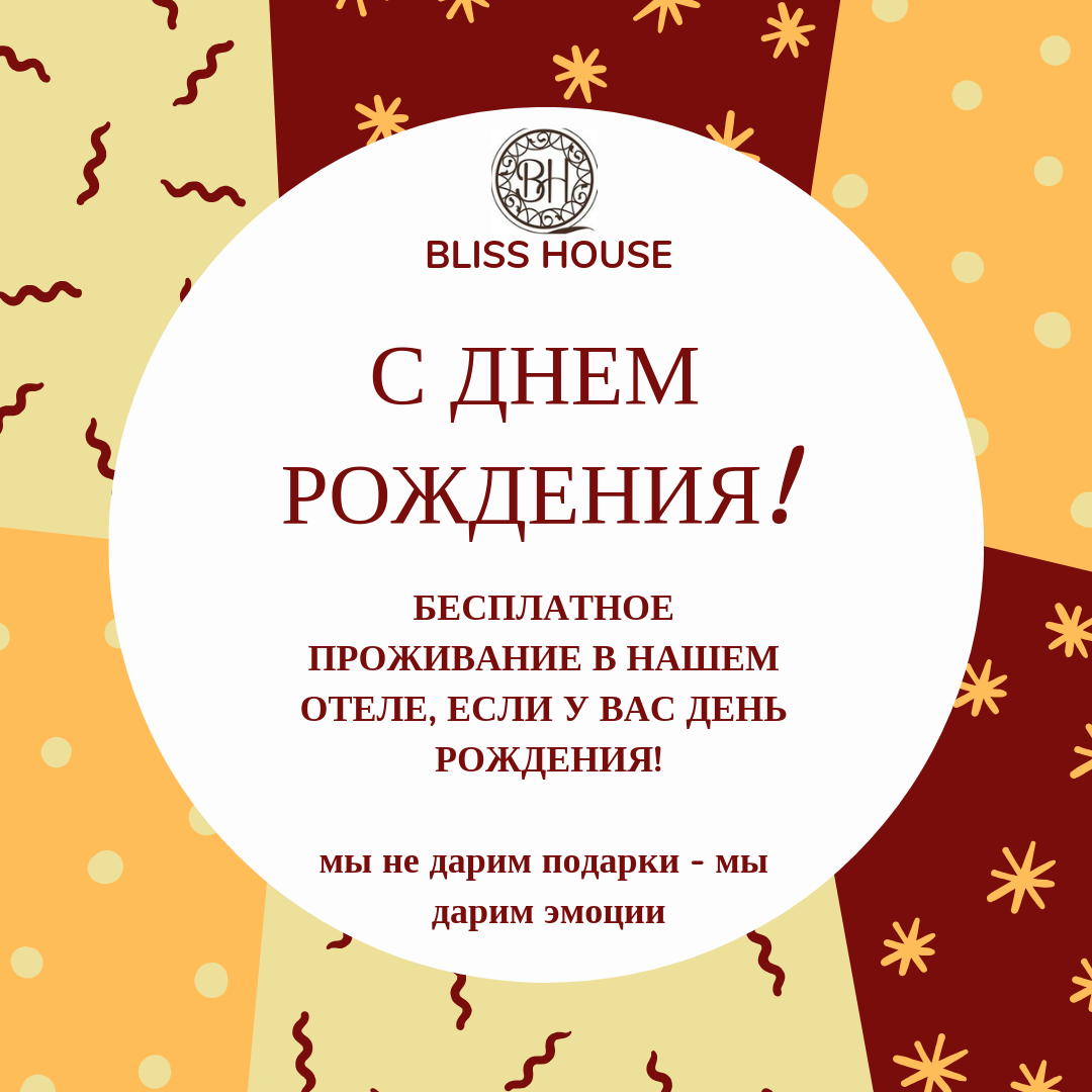Мы не дарим подарки - мы дарим ЭМОЦИИ!А вместе с ними - ПОДАРКИ для всех именинников! Бесплатное проживание в отеле "Bliss House", чтобы отметить День Рождения! Какие условия: - бесплатные сутки проживания предоставляются только на номер, в котором проживает именинник - акция действует за 2 дня до даты рождения и в течение 2-х следующих дней. Что нужно сделать: - забронировать номер и показать нам паспорт! Куда нажать: + 7 988 402 1000 blisshouse.ru https://www.facebook.com/BlissHouseHotel https://vk.com/blisshousesochi