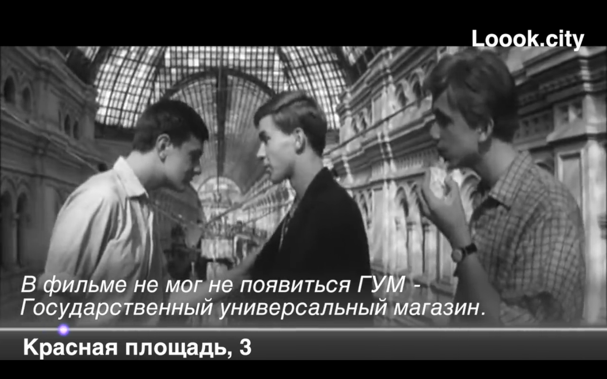 С началом «оттепели» Никита Сергеевич решил вернуть в него торговлю, как символ нового, и за ГУМом надолго закрепилось имя самого знаменитого универсального магазина Москвы. Туда ехали за обновками и подарками гости столицы. Что мы и наблюдаем в этой сцене из фильма.