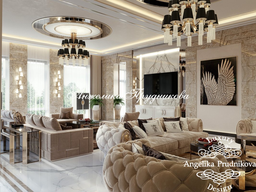 Мраморная отделка, авторские бра, много золота в декоре – оформленный с соблюдением классического принципа симметрии холл выглядит как вестибюль королевского особняка. Из него через широкие порталы можно попасть в столовую и в гостиную, где внимание сразу привлекает современный линейный камин, занимающий одну из стен.