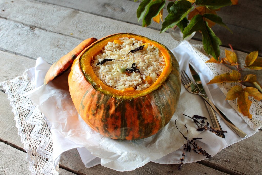 И снова о излишках тыквы, которая так и наравит взять да подпортиться! Но этому не бывать, так как у нас в запасе еще много рецептов с тыквой! и один из них предоставлен ниже: Берем тыкву не очень большую, а лучше несколько поменьше!Срезаем крышку и вычищаем мякоть. Внутри смазываем растительным маслом.Берем мясо, любое, и любое количество, зависит от количества гостей и ваших предпочтений.Мясо режем кубиками как на жарку.Мякоть тыквы, которую вы вынули очищаем от косточек и также нарезаем на кубики.лук нарезаем на полукольца, морковь шинкуем на терке, и обжариваем оба ингридиента. Тыкву заполняем мясом, мякотью, морковью и луком, солим и перчим по вкусу. Закрываем верх срезанной тыквенной крышкой и ставим в духовой шкаф на 1.5-2 часа, в зависимости от размеров тыквы.Чтобы мясо внутри не пересохло, на противень наливаем немного воды.Через заданное время, достаем, открываем крышечку, и посыпаем тертым сыром. На самом деле, здесь вариаций может быть очень много, и добавлять внутрь тыквы