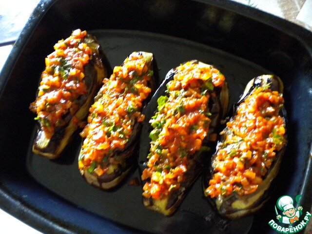 Когда были в Армении мне довелось попробовать баклажаны с сыром приготовленные в духовке. Я хочу с вами поделится рецептом. ИНГРЕДИЕНТЫ Баклажаны 4 шт. Помидоры 2 шт Твёрдый сыр 400 гр Яйца 2 шт. Сливочное масло 15 гр Чеснок 4 гр Соль по вкусу. С чистых баклажанов срезаю "хвостики", делаю продольные надрезы и вынимаю ложечкой семечки. Ставлю на огонь подсоленную водичку и когда она вскипит, кладу туда минуток на пять баклажанчики. Затем сливаю воду через дуршлаг. Делаю начинку из тертых сваренных в крутую яиц, растопленного сливочного масла и тертого на мелкой терке голландского сыра. Фарш обжариваем. Помидоры режем на кругляшки . Добавляем фарш в смесь из яиц. Затем по кусочку помидорки. Готовую еду посыпаю пропущенным через чесночницу чесноком . Если вы любите по острее то чеснока берите по больше. Запекаю баклажаны на смазанном сливочным маслом противне в духовочке при 140-160С. 25 минут . Затем посыпаю зеленью .и подаю к столу ,можно подавать с мацуна как