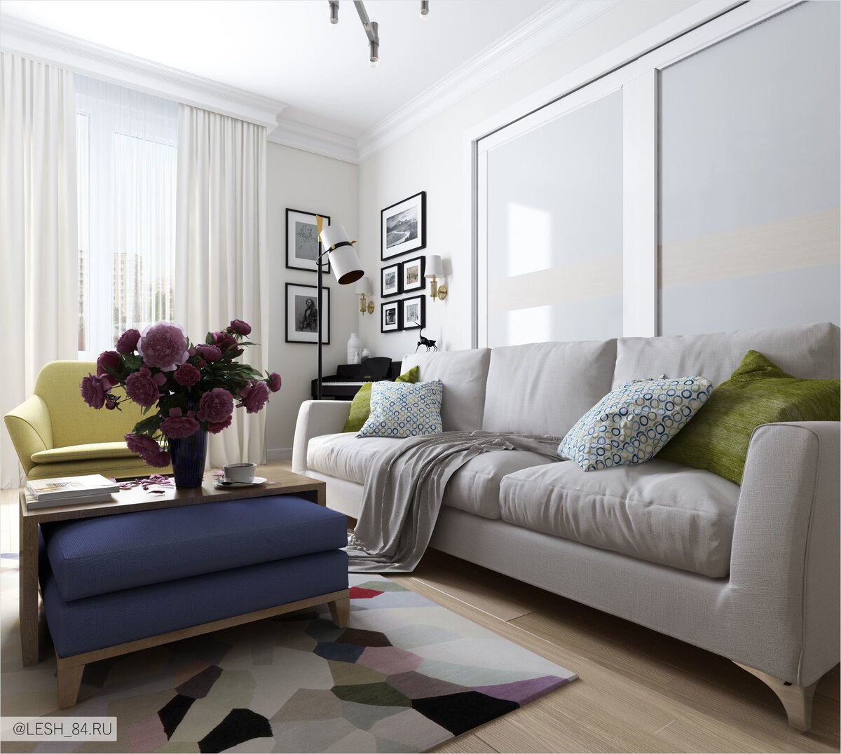 Клиенты не хотели существенно менять планировку. В данном случае нашлось место для спальни, кухни, гостиной, просторного холла с собственной библиотекой, детской комнатой, ванной и санузла. Стилистические пожелания хозяев были сформулированы как “легкая эклектика”. Не то чтобы интерьер содержит какие-то шокирующие вещи – наоборот он очень спокоен, функционален и практичен, тут нет никаких сложных архитектурных решений. Но все же он получился удивительно разнообразным по цветам и насыщен мелкими декоративными элементами. Гостиная Стены выкрашены краской светлого цвета — чтобы зрительно увеличить квартиру. Исключение составляет лишь пространство вокруг телевизора, которое украшено обоями с геометрическим рисунком. При этом самым ярким цветовым акцентом являются жёлтые кресла, пуф и текстиль, остальные преобладающие цвета в интерьере - приглушенные пастельные оттенки. Серванты выполнены по эскизам дизайнера. Возможность полностью изолировать кухню была одним из немногих требований хо
