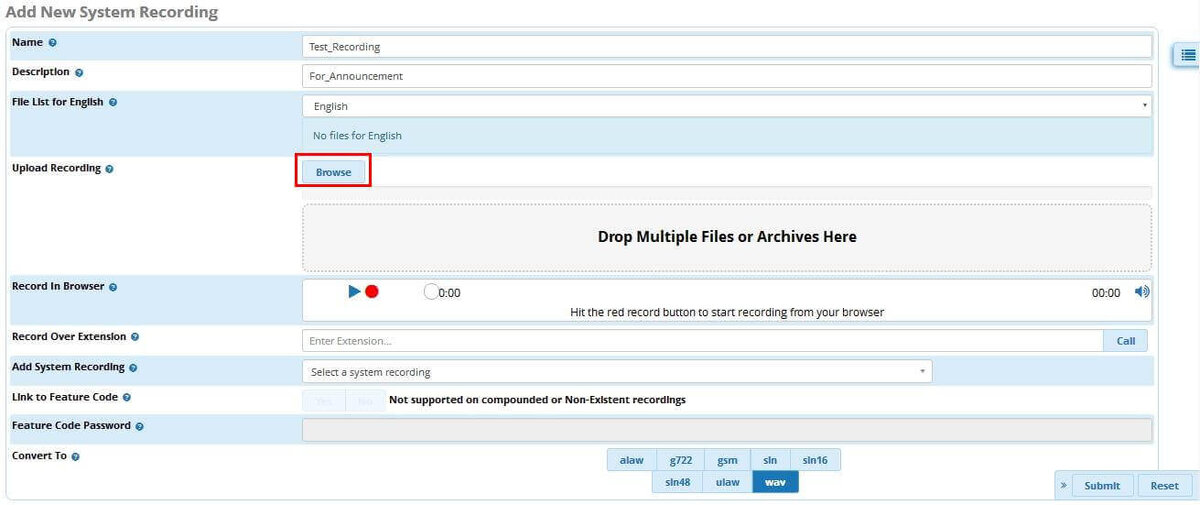 В сегодняшней статье поговорим о модуле звуковых записей System Recordings, который позволяет управлять встроенными, стандартными звуковыми файлами Asterisk, а также дает возможность создавать собственные, которые потом можно использовать для Голосового приветствия, IVR, Очередей и так далее. Добавить запись можно тремя способами: загрузить звуковой файл, записать с помощью браузера и записать через модуль Extensions. Перейдем к настройке и рассмотрим каждый из возможных способов создания новой записи. Традиционно, рассматривать будем на примере FreePBX 13. СПОСОБ 1: ЗАГРУЖАЕМ ЗВУКОВОЙ ФАЙЛ Чтобы попасть в модуль System Recordings необходимо перейти по следующему пути Admin -> System Recordings. Откроется страница добавления новой записи Нажимаем Add Recording Задаем новой записи имя, можно добавить описание. Далее необходимо нажать Browse. Система предложит выбрать какой-нибудь звуковой файл, который находится у вас на компьютере. Также, во FreePBX 13, появилась возможность быстро заг