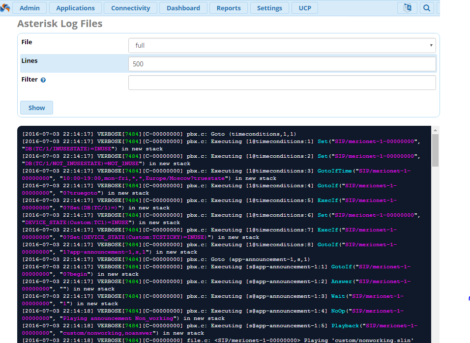 В статье речь пойдет о логах в Астериск. Существует встроенный модуль для FreePBX - Asterisk Logfiles Module, который позволяет просмотреть самые недавние события. ПРОСМОТР ЛОГОВ С ПОМОЩЬЮ FREEPBX Модуль можно найти по следующему пути: Reports – Asterisk Logfiles. Однако, данный модуль мало полезен, если требуется проверить не только недавние логи, но и недельной, а то и месячной давности. Если появилась такая нужда, требуется подключится к вашей АТС по SSH, например, используя терминальный клиент PuTTy. Кроме того, если есть физический доступ к серверу, можно использовать и его. Почему проще использовать терминальный клиент? Ответ прост – PuTTy поддерживает операции копировать\вставить, что многократно упрощает работу. ПРОСМОТР ЛОГОВ ЧЕРЕЗ КОНСОЛЬ Итак, порядок действий для доступа к логам Астериск: Обычно, все файлы называются «full-DATE», где DATE – дата логирования. Если требуется посмотреть и отсеять сегодняшний лог-файлы, нужно ввести nano full . Данная команда откроет лог-файл с