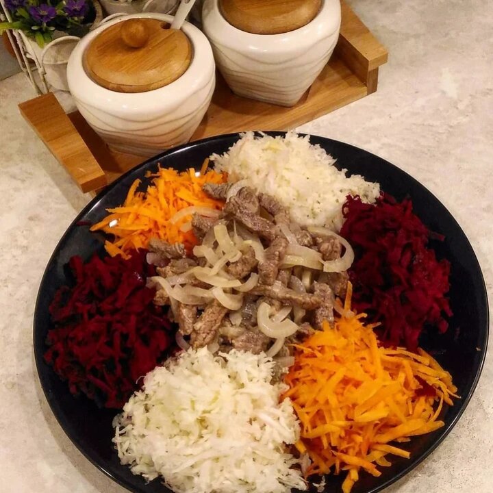 Сырые овощи чистим и натераем на крупной тёрке (капусту можно мелко нашинковать), раскладываем поочередно кучками на блюдо, в центр кладем мясо и выливаем соус.
