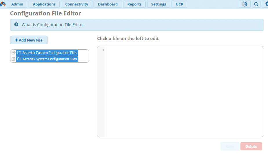В данной статье пойдет речь о модуле под названием Configuration File Editor, модуле, который позволяет редактировать дополнительные (custom) файлы конфигурации в браузере – обычно эти файлы редактируются с помощью CLI или сторонних программ, таких как WinSCP. Что бы открыть данный модуль, необходимо в выпадающем меню вкладки Admin -> Config Edit Как видно выше – в модуле можно создать новый файл, и так же доступны две вкладки: Обратите внимание на надпись «File is not writable» - кнопки «Save» и «Delete» так же неактивны. Важно: