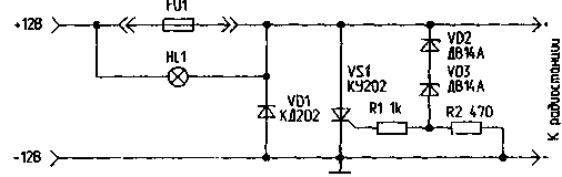 Предлагаемая схема обезопасит радиоаппаратуру например радиостанцию или магнитолу, от выхода и: строя при случайной переполюсовке или повышении напряжения питания (то нередко бывает при неисправности генератора в автомобиле). Схема работает следующим образом. При правильной полярности и номинальном напряжении диод VD1 и тиристор VS1 закрыты, и ток через предохранитель FU1 поступает на выход устройства. Если полярность обратная, диод VD1 открывается и сгорает предохранитель FU1. Лампа HL1 загорается, сигнализируя об аварийном подключении. При правильной полярности, но входном напряжении, превышающем установленный уровень, задаваемый стабилитронами VD2 и VD3 (в данном случае - 16 В), тиристор VS1 открывается и замыкает цепь накоротко, что вызывает перегорание предохранителя и зажигание аварийной лампы HL1. Предохранитель FU1 должен быть рассчитан на максимальный ток, потребляемый радиоаппаратурой. Источник: РЛ-7/96