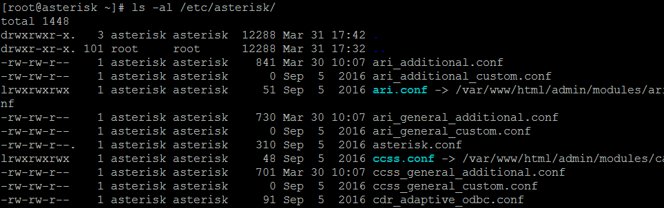 - Чтобы посмотреть содержимое директории, воспользуйтесь командой ls -al. Например, чтобы посмотреть все содержимое в директории IP – АТС Asterisk, дайте команду ls -al /etc/asterisk/