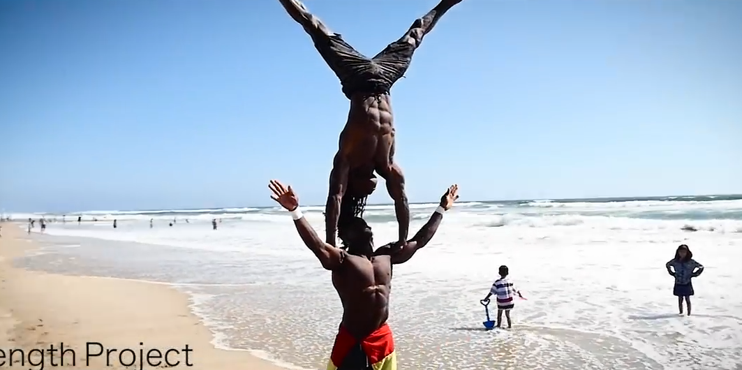 Очень мощные атлеты вышли на пляж для акробатических этюдов. Довольно интересно поглазеть на них