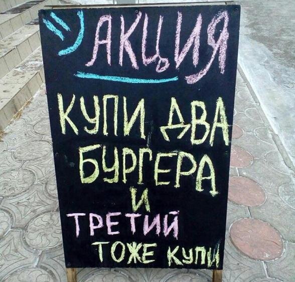 Привет, меня зовут Сергей Федулов, и здесь на моем канале вы найдете мои авторские статьи о маркетинге. Сегодня я повыбирал из своего архива 5 примеров штендеров, которые могут зацепить внимание покупателя. Вот они 1. 2 бургера Мы с вами, покупатели, привыкли, что если предлагается какая-то акция, то что-то обязательно должно быть бесплатным. Ан нет! Вот эта бургерная сработала на контрасте, избрав другой подход. 2. Цьмо Игры с цитатами, особенно выдуманными, довольно часто приносят свои плоды. Это хороший ход. Главное, правильно адаптировать его под свой бизнес. 3. Обычная жизнь Просто покажи разницу между тем, что имеет клиент, и тем, что предлагаешь ты. На контрасте это успешно работает. 4. Оксана Стихотворные формы в маркетинге - дело благодарное. Люди легко воспринимают такие вещи. Потому что ты не продаешь (в прямом смысле), а просто привлекаешь внимание и развлекаешь. 5. Голодные Ну, вот, пожалуй, еще 1 прикольный пример. Здесь мы видим уже проявление заботы о покупателе. Эт