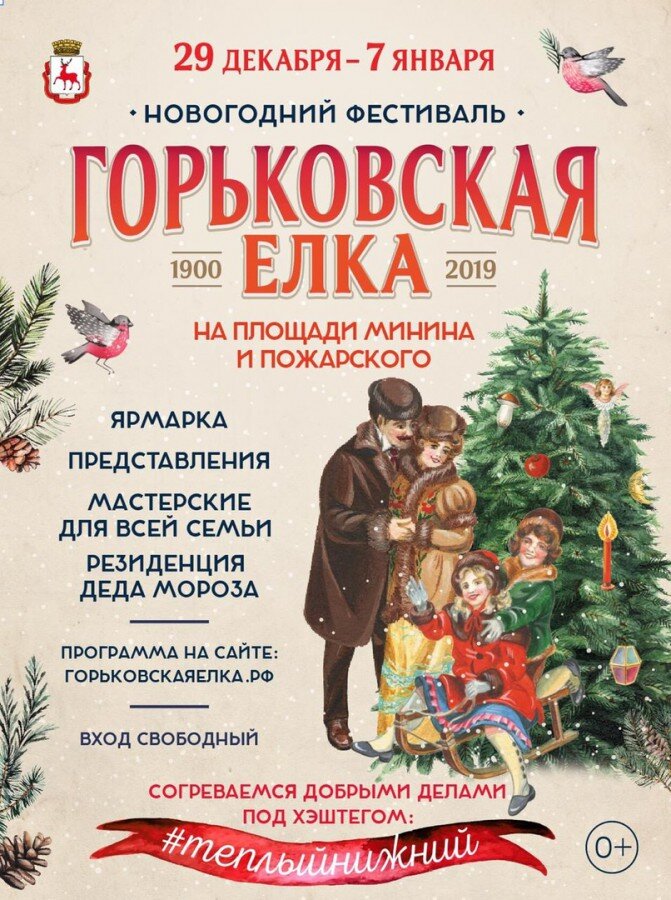 Традиция проведения благотворительных елок принадлежит писателю Максиму Горькому. В 2016 году было решено возродить традицию празднования Горьковских елок и уже третий год подряд на площади Минина и Пожарского с 29 декабря по 7 января нижегородцев ждут 3d-маппинг-шоу, резиденция Деда Мороза, музыка и танцы, детская и семейная программа, творческие мастерские. Главная тема Горьковской елки-2019 – тепло добрых дел.