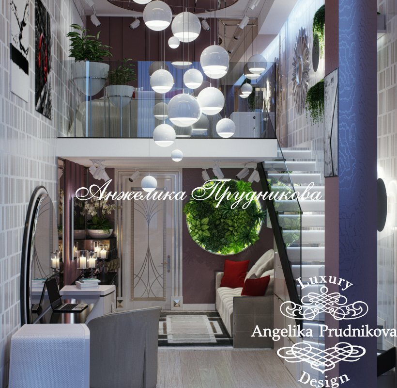 Первый же «этаж» представляет собой общественную зону. Гостиная с мягким диваном и книжным стеллажом разместилась прямо под лестницей и выглядит очень уютно. Ее дополнили оригинальным настенным фитомодулем в форме круга и собственной подсветкой. Прямо напротив дивана авторы проекта оборудовали ТВ-зону. А рабочее место и подвесное кресло сместили к окну. Полная фотогалерея проекта: https://angelika-prudnikova.design/dizajn-portfolio/detskie/dizayn-proekt-interera-detsko