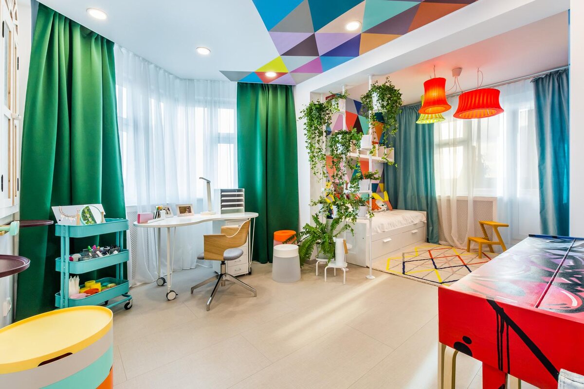 Натяжные потолки замечательный способ подчеркнуть индивидуальность вашего интерьера. С помощью цвета можно визуально преобразовать помещение: увеличить или уменьшить пространство комнаты, придать особенное настроение. Если вы решили отказаться от традиционных белых потолков и создать свой неповторимый дизайн интерьера, важно помнить несколько правил. Цвет потолка должен гармонировать с другими элементами интерьера: мебелью, шторами, картинами. Используйте одно из дополнительных цветов пятен при выборе цвета. Не следует подбирать цвет потолка под цвет стен — это визуально сделает потолки низкими. Пусть потолки будут светлее или темнее на несколько тонов. Подбирайте цвет потолка в зависимости от высоты потолков и освещения комнаты. Двухуровневый натяжной потолок в детской зонирует пространство. Цвета в комнате яркие, но не кричащие. Это создает атмосферу позитива и не отвлекает от занятий. Детская комната для малыша оформлена в едином стиле. Каждая деталь подобрана со вкусом. Интерес