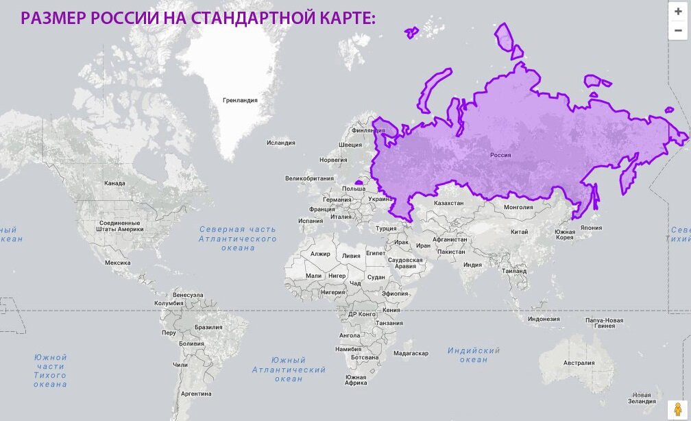 Из-за искажений стандартных географических карт площади стран порой очень сильно меняют свой истинный размер. Вот так выглядит привычная нам карта мира. де большую часть на севере занимает наша с вами Родина. На деле же оказывается, что Россия хоть и самая большая страна в мире (17,1 млн км2), но не такая уж громадная, как представлено на наших картах. Если сравнить площадь России с площадью Африки (30,4 млн км2), то наша страна практически дважды помещается на территории "чёрного" континента. Маленькая Индия (3,3 млн км2), оказывается, чуть меньше нашей Европейской России (3,5 млн км2). Теперь понятно, как там размещается почти полтора миллиарда человек. А площадь Китая (почти 10 млн км2) занимает больше половины площади России (17,1 млн км2). Кстати, площадь Антарктиды не многим меньше площади нашей страны и составляет порядка 14 млн км 2, что, как мы уже знаем, более, чем в 2 раза меньше площади Африки. Ниже я привожу 50 самых больших по площади (км2) стран мира (50-е место у Испани