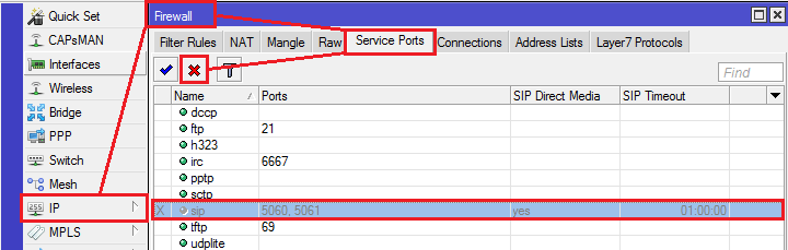 Либо отключить его используя CMD Mikrotik: /ip firewall service-port disable sip