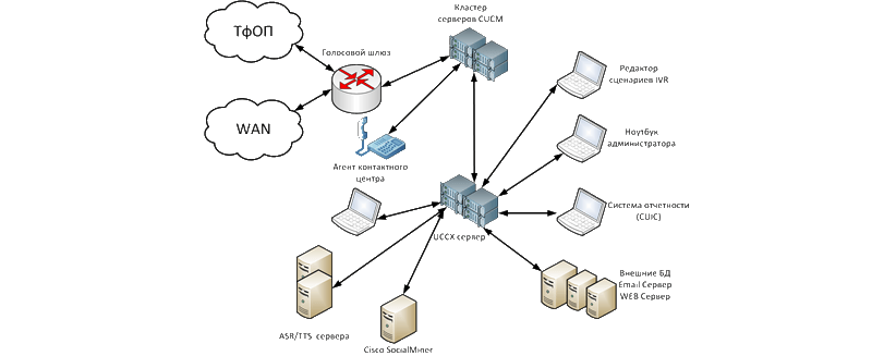 Решение Cisco для контактных центров UCCX является решением для взаимодействия с клиентом. Основными функциями CCX является обеспечение функционала голосового меню Interactive Voice Response (IVR) и распределение вызова Automatic Call Distribution (ACD). Голосовое меню (IVR) это программный продукт, обеспечивающий клиента возможностью самообслуживания. Обычно, IVR используется для входящих вызовов. При звонке клиенту предлагается нажать одну или несколько кнопок для связи с тем, или иным отделом, предоставляется возможность распознавания речи Automatic Speech Recognition (ASR), автоматически произносится запрашиваемая информация по технологии Text to Speech (TTS). Данное взаимодействие осуществляется по протоколу Media Resource Control Protocol (MRCP), который описан в RFC 4463. Посмотрите структуру взаимодействия UCCX в корпоративном сегменте: Корпоративная сеть с элементом контактного центра на базе решение Cisco Unified Contact Center Express весьма обширна, поэтому, давайте разбира