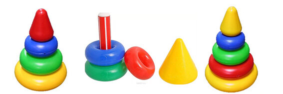 1. Пирамидка Одно из ведущих мест в развитии малыша занимает пирамидка. Эта игрушка должна сопровождать ребенка с самого раннего возраста. Как только кроха уверенно начал сидеть ему можно предлагать самые простые пирамидки, не более трех, четырех колец и желательно 4 основных цвета. Стержень пирамиды должен быть достаточно толстым, а диаметр отверстий колец гораздо шире диаметра стержня, чтобы малышу было легко нанизывать кольца. В этом возрасте задача ребенка снимать и надевать кольца, развиваем координацию движений и мелкую моторику рук. Постепенно увеличиваем количество колец, по мере взросления крохи, учим ребенка сравнивать кольца по размеру (большое, поменьше, самое маленькое), а затем уже учим правильно собирать пирамидку: сначала самое большое кольцо, затем выбери самое большое из оставшихся колец и таким образом собираем правильную пирамиду. Пирамиду можно не только собирать, но использовать для развития других навыков ребенка: - сравнение по размерам (большой кукле - бо