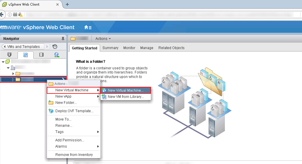 Первым делом, нам нужно cоздать виртуальную машину в среде виртуализации. Для этого, переходим в VMware vSphere Web Client (у вас может быть толстый клиент, разницы нет), в разделе VMs and Templates выбираем директорию, в которой будет создана новая виртуальная машина (если у вас их несколько), а затем, нажимаем на директорию правой кнопкой мыши, выбираем New Virtual Machine → New Virtual Machine: