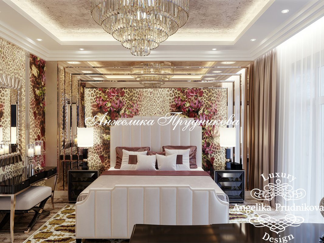 Для дизайна спальни в частном коттедже в Брянске специалисты Студии Анжелики Прудниковой выбрали стилистику арт-деко, для которой характерны роскошная отделка, игра контрастов и богатство фактур. Это позволило создать необычный интерьер с яркой индивидуальностью. Модное сочетание анималистичного и цветочного принта в отделке стен выглядит свежо и неординарно. Зеркала добавляют обстановке блеска и торжественности, как и серебристые аксессуары. А черные прикроватные тумбы, туалетный столик и комод в ТВ-зоне делают обстановку современной и динамичной.