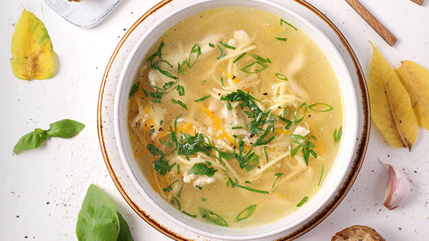 При подаче готовый суп-лапшу с курицей посыпьте чесноком и свежей зеленью.