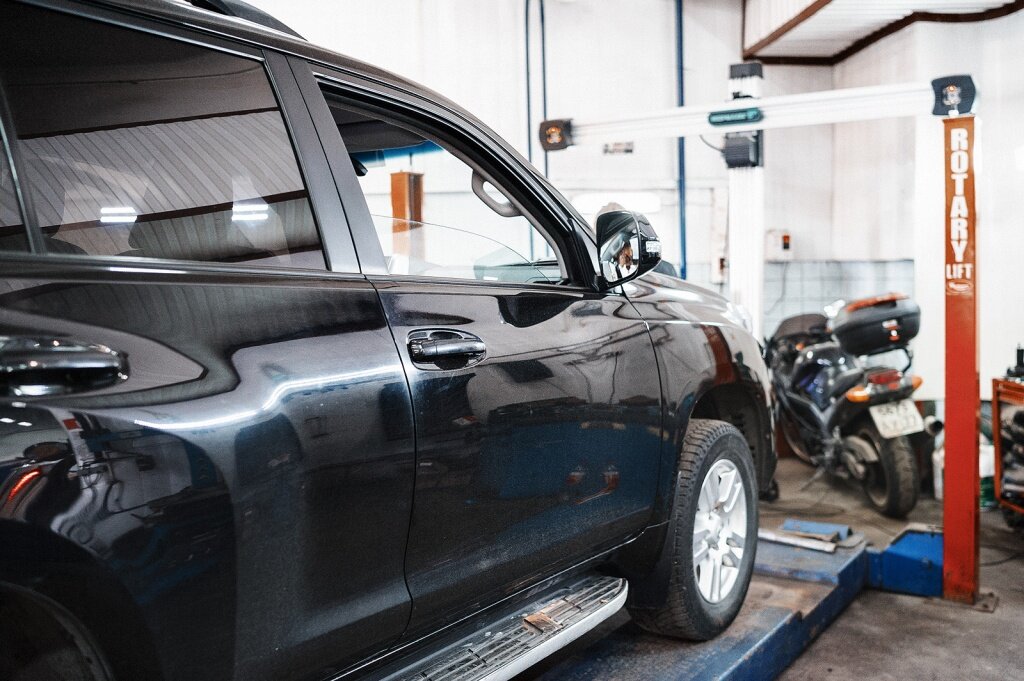 Владелец сетовал на увод машины вправо. Поднимаем автомобиль, проверяем подвеску на люфты, а сайлентблоки на надрывы. Всё чисто, никаких претензий. Смотрим на состояние резины – 4 одинаковых колеса с равной степенью износа, давление соответствует паспортному. Вывод простой, Toyota Land Cruiser нуждается в развале. Переезжаем на четырёхстоечый подъёмник.