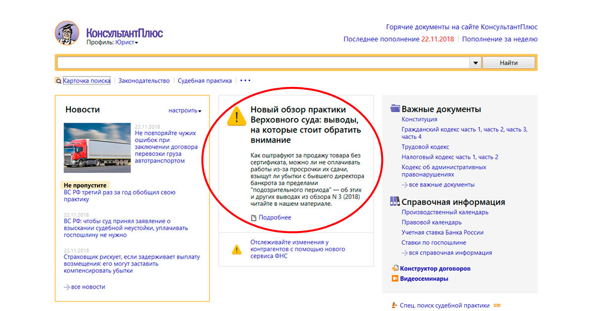 В КонсультантПлюс в профиле "Юрист" появились напоминания о важных правовых событиях. Они отображаются на стартовой странице. Напоминания помогут не пропустить изменения в законодательстве, важные выводы судов, расскажут о новых полезных сервисах, подскажут, где посмотреть нужную для работы информацию. На напоминания можно подписаться прямо в системе и регулярно получать их по электронной почте – внизу стартовой страницы введите своей адрес и нажмите "Подписаться". Подробнее