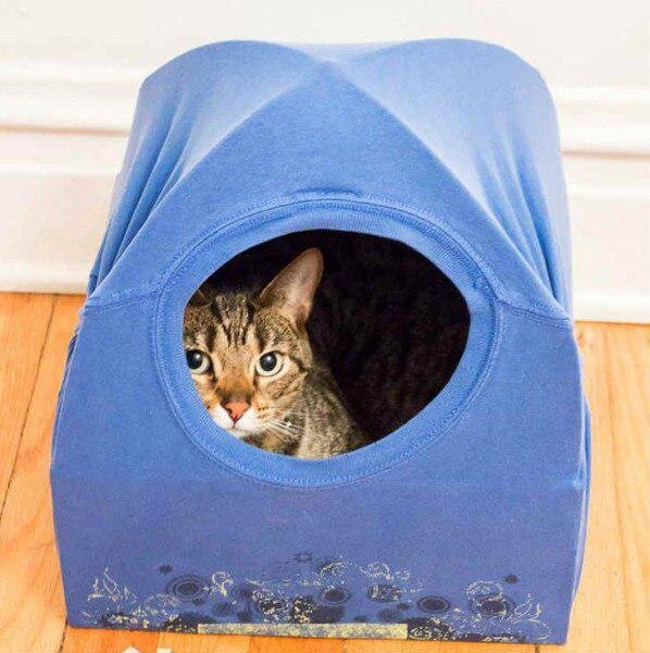 Простой способ сделать домик для кота. Расходный материал: лист картонки, строительный скотч, проволока 4 - 5 мм. ( можно использовать 2 не нужных металлических вешалки из проволоки, откусив от них верх ), кусочек изоленты, не нужный свитер или джемпер. Берем скотч и обклеиваем края картонного листа, придав им прочное основание. Затем шилом протыкаем углы в нашем картонным листе. Делаем из проволоки дуги и вставляем их в отверстия на картонном листе. Снизу концы проволоки загибаем, а сверху крестовину перематываем изолентой, придав тем самым прочность конструкции. Теперь надеваем джемпер или свитер на конструкцию, немного утягиваем его снизу и скрепляем скрепками или просто подшиваем ниткой с иголкой. Отверстие в джемпере ( шея ) будет служить входом и выходом для кота.