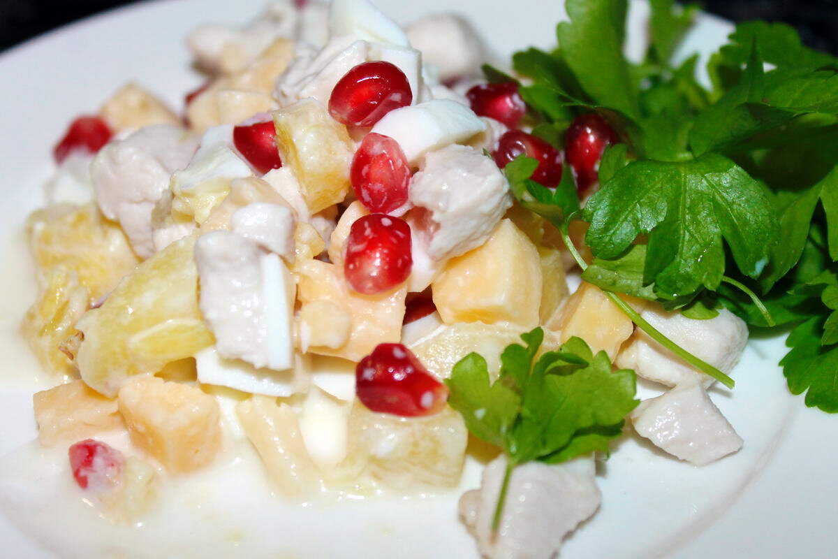 Привет!:) Вообще-то, конечно, этот салат не только праздничный, а вполне себе обыденный, но на праздничном столе он будет смотреться вполне уместно. Оливье же смотрится :) Потому что и вкусно, и привлекательно. И сладковато. Если вам понравится рецепт, и в конце вы поставите палец вверх, вам не сложно, а мне – приятно :) Нам понадобится: Куриное филе – 300 гр Ананасы из банки – 300 гр Яйца куриные – 2 штуки Сыр, который вам нравится – 200 гр Гранат – ¼ Майонез – половина столовой ложки Как готовить: Отварить яйца и курицу до готовности. Я взял куриную грудку, но сюда подойдет любая часть курицы, а с копченой будет еще вкуснее. Но копченую брать не стал, потому что детям вредно. Когда яйца и курица готовы, все остальное крайне просто. Ананасы, яйца, сыр и курицу порезать, как хотите. Я резал относительно крупно, но лучше бы делать помельче, чем на фото. Сложить в емкость и смешать с майонезом. Потом добавить ядра граната. Соль я не добавлял, потому что варил курицу в сильно соленой вод