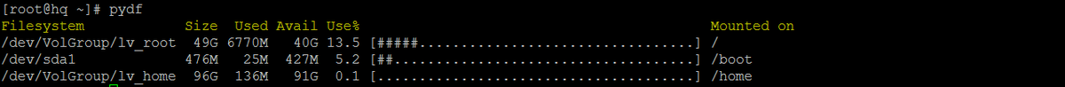 Если у вас не исполняется данная команда, то вам необходимо установить pydf дополнительно. Например, в CentOS это можно сделать командой sudo yum install pydf.