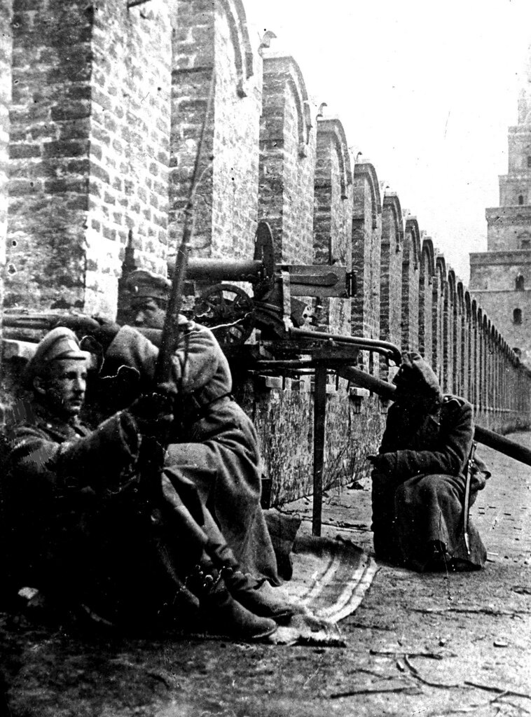 Кстати, некоторые историки оценивают эти столкновения как начало Гражданской войны в России. Юнкера на защите Кремля Архангельский собор после обстрела Поврежденное здание на Никитском бульваре Здание у Никитских ворот после обстрела Повреждённый артиллерийским огнём Малый Николаевский дворец в Кремле. Повреждения стен собора Двенадцати Апостолов. Поврежденная Спасская башня Кремля Беклемишевская башня Кремля Фасад гостиницы «Метрополь» Чудов монастырь Покои митрополита в Чудовом монастыре Успенский Собор Кремля после обстрела Церковь 12 апостолов после обстрела Никольские ворот Кремля Братская могила большевиков Страшное время