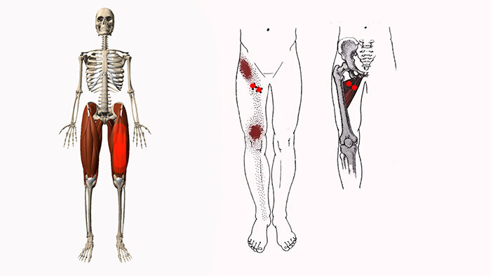 Боль в бедре спереди (по передней поверхности бедра) Боль в области передней поверхности бедра могут вызывать триггерные точки, расположенные в: — длинной и короткой приводящей мышцах бедра; — подвздошно-поясничной мышце; — большой приводящей мышце; — промежуточной широкой мышце; — гребенчатой мышце; — портняжной мышце; — квадратной мышце поясницы; — прямой мышце бедра. Боль в бедре и в тазу по наружной поверхности Болевые ощущения по наружной поверхности бедра и таза могут вызывать триггеры в: — малой ягодичной мышце; — боковой широкой мышце; — грушевидной мышце; — квадратной мышце поясницы; — напрягателе широкой фасции; — промежуточной широкой мышце; — большой ягодичной мышце; — боковой широкой мышце. Боль в бедре по внутренней поверхности Болевые ощущения по внутренней поверхности бедра вызывают триггерные точки в: — гребенчатой мышце; — медиальной широкой мышце; — тонкой мышце; — большой приводящей мышце; — портняжной мышце. Боль по задней поверхности бедра Боль в бедре по за