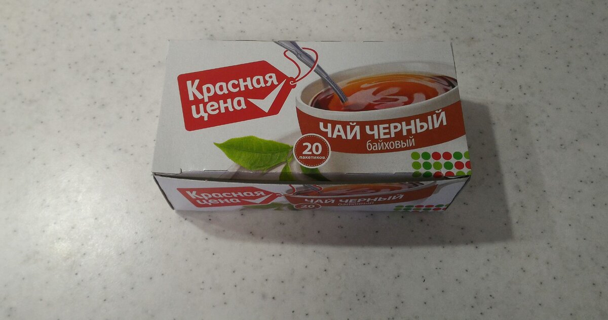 Черный байховый чай марки Красная цена за такую огромную сумму я купил недавно в Пятерочке. Эта марка не перестает меня удивлять своими продуктами и их стоимостью. Пока что я нашел только один нормальный продукт этой марки - Лечо. Посмотрим как дела обстоят с чаем. Упаковка Упаковка обычная, как у пакетированного чая. В коробке 20 пакетиков по 1,5 грамм. Сами пакетики без ярлычков, за такую цену это роскошь, и соединены по двое. неудобно конечно, но все-таки продукт очень бюджетный. Упаковка не самое главное. Состав Чай черный байховый индийский для разовой заварки, первый сорт. За 12 рублей нам предлагают байховый чай т.е. сорта "Бай Хоа", к тому же не самого худшего 1 сорта (самый худший 3 сорт). Завариваем Как обычно залил кипятком. Чай очень долго заваривался и ... не заварился! По цвету, будто пакетик используется второй раз. Цвет слишком светлый для черного чая. Аромат и вкус Его почти нет. Запах слабый, но больше пахнет заваренным шиповником или сбором трав, но не чаем. Вкус