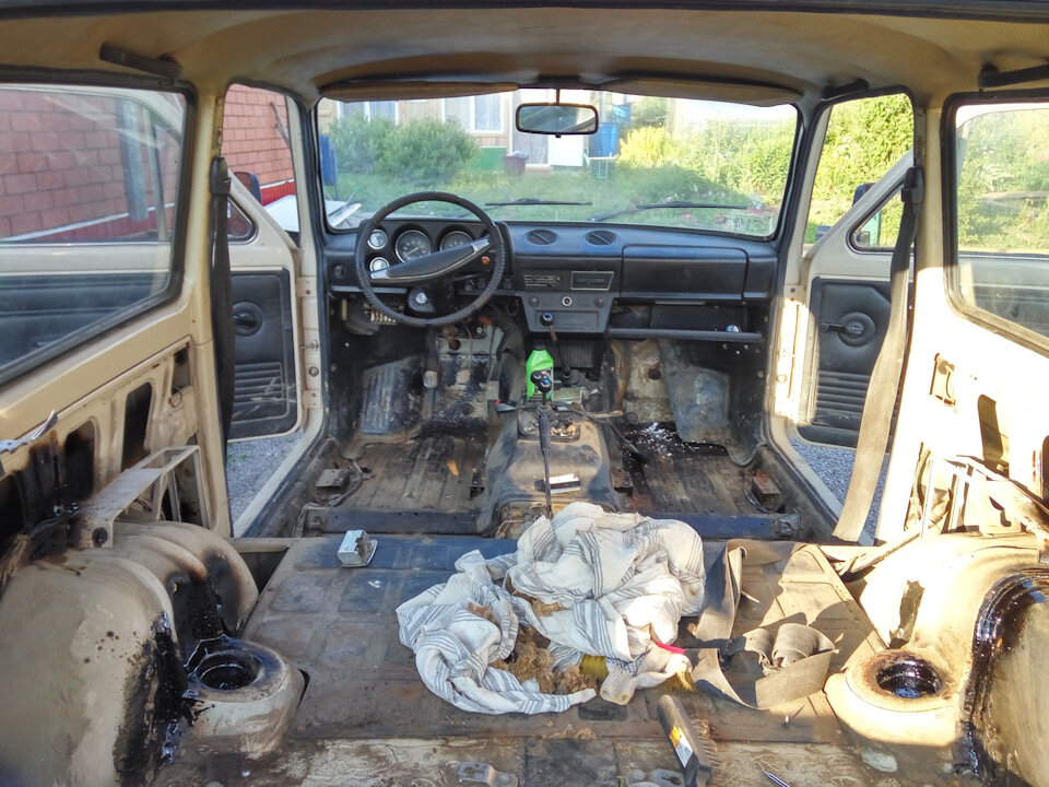 Перепало мне в 2011 году сие чудо . 1985 год, пробег чуть больше 20к. Купил у деда из деревни Заря . То что видите на фото выше - так и досталась, приехал домой на табуретке . Но не буду врать, на фото она уже после переборки железа (переварили арки) и покраски, не додумался снять то, какой она была до . И тех куриц, что предыдущий хозяин там поселил. Ну а дальше за дело уже взялся сам. Прежде всего начал отдирать всю старую грязь. Громко, с матом, тоннами растворителя . Затем настала очередь потолка и очередного потока мата, так как под ним оказалась минеральная вата . Которая с радостью вонзилась мне во все места, до которых смогла дотянуться . Не такая жесть, как стекловата, но все-таки . После очистки потолка закатал его в вибру и приделал вот такой потолок: Выглядит он неплохо . Затем настала очередь салона . Я смог найти все, кроме обшивки пола и водительского сиденья . Пришлось выкручиваться как смог . Сварщик я конечно никакой, но сиденье держится и по сей день . И если с