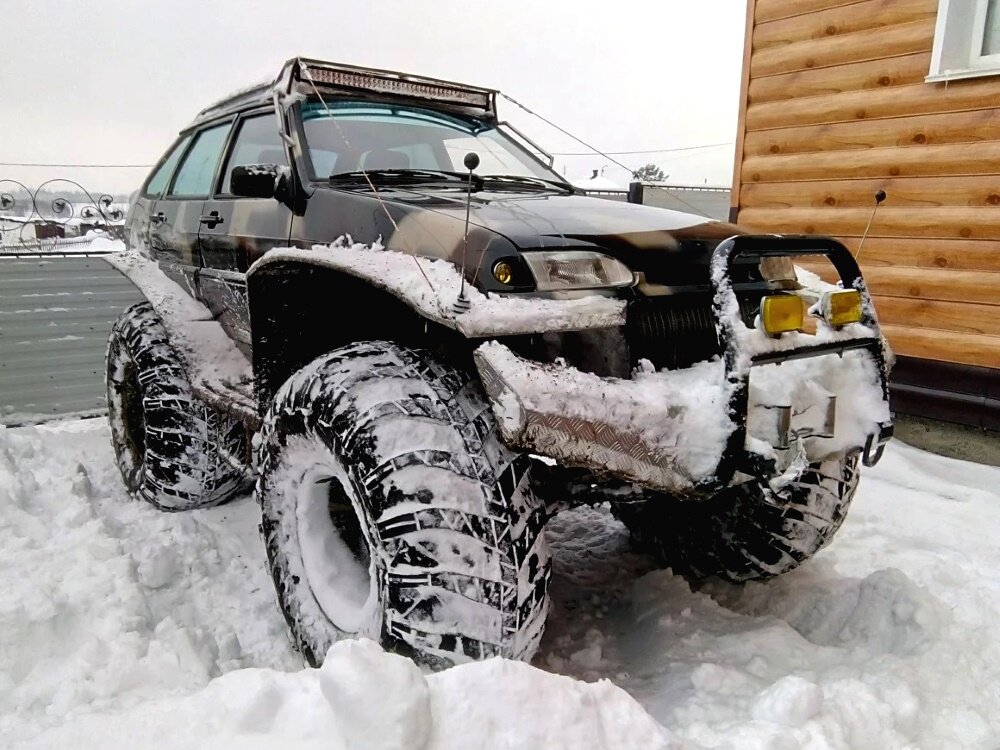 Вся эта «начинка» накрыта кузовом не утилитарного внедорожника, а хэтчбека ВАЗ-2114, у него же взят и салон. Естественно, нижнюю часть кузова пришлось перекроить — чтобы она сочеталась с полноприводным шасси.