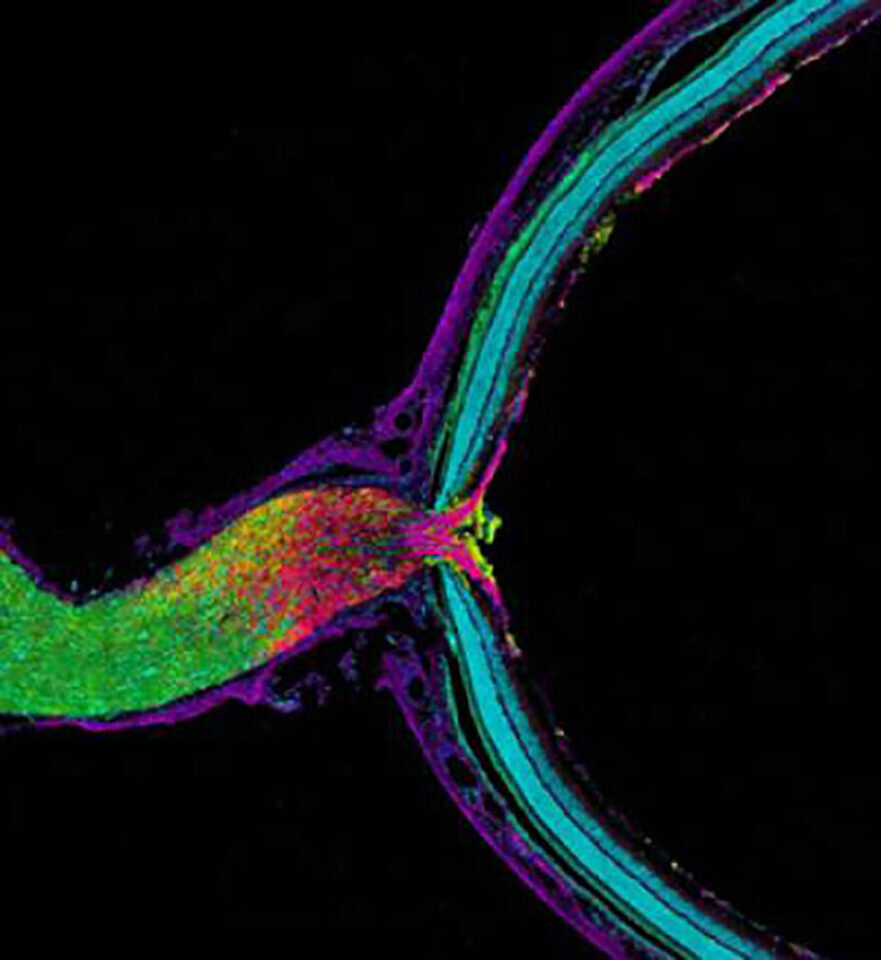 В любой фотографии важен ракурс. В том числе — и в научной. Поэтому сегодняшнее ночное фото на портале необычно. Не часто увидишь сетчатку в профиль. Да еще и место, где она переходит в зрительный нерв! Зеленым показана миелиновая оболочка нерва, фиолетовым — аксоны ганглионарных клеток сетчатки, голубым — их ядра, жёлтым — астроциты.