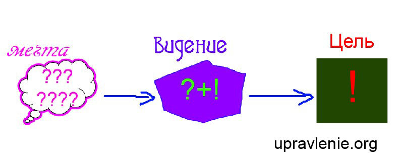 Чем отличается мечта от цели в жизни? Возможно вас заинтересует еще одна статья — «Что такое »Настоящая Цель", воспользуйтесь поиском на сайте. 1.Отличие — у Цели есть метод достижения. Обычно такой метод называют «стратегией». У Мечты нет плана достижения. Если вы скажете что у вас есть Цель, но пока нет плана достижения цели, будьте уверены — это пока Мечта, она превратится в Цель, в тот момент, когда у вас появится понятный, для вас, план действий. 2.Отличие. Процесс мечтания имеет с эмоциональный «оттенок», а Цель имеет рациональный «оттенок». Цель может содержать и рациональную часть и эмоциональную, а мечта не имеет рационального обоснования. 3.Отличие — вытекает из первого пункта — этапы реализации и промежуточные задачи и подцели Между Целью и Мечтой, есть еще «Видение». В бизнесе, есть аналог понятия «мечты» — «видение». *В слове вИдение, ударение на «и». Между ними есть конечно отличие, «видение», это что-то среднее между мечтой и целью. Обычно на стратегических сессиях, п