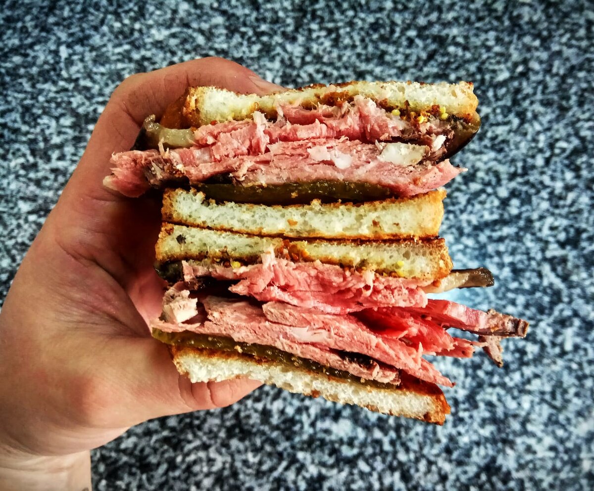 Друзья привет! Сегодня пятница, а это значит что работы просто вагон и нужно перекусить на скорую руку. Благо на кухне это всегда легко, так как очень много заготовок под рукой. Сегодня поговорим о бутерброде. А Вы любите бутерброды? А какой самый любимый? Как часто их едите? Я вот переодически употребляю их в пищу. В основном люблю сытные и большие, как например сегодняшний: Поддержите мой канал, подписывайтесь и ставьте лайки это поможет развитию. Нам потребуется: -Буженина, ростбиф, пастрами 100гр -Горчица зерновая 15гр -Огурец бочковой 20гр -Баклажан запеченый 30гр -Батон 2 кусочка -Масло сливочное 10гр Итак этот бутер я сделал из того что нашел в холодильнике. Разогреваем сковороду, кладём сливочное масло и затем обжариваем батон с двух сторон на масле. Булочки должны получить поджаристую хрустящую корочку. Затем любое мясо, будь то буженина или ростбиф, нарезаем тоненькими слайсами, чтобы удобнее было жевать. Огурец так же нарезаем тонкими слайсами, у меня был бак
