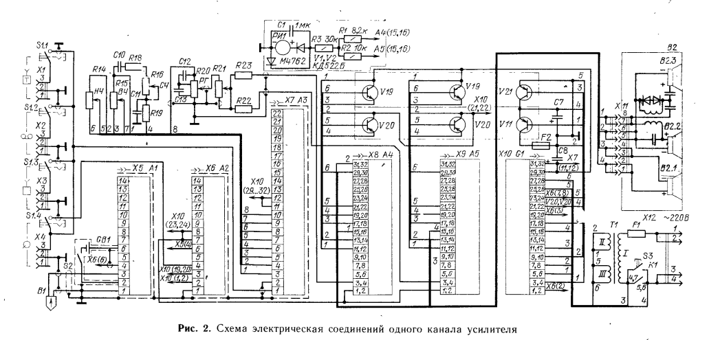 ^ Двухполосный усилитель мощности. Усилители мощности низких и высоких частот идентичны и выполнены на комплементарных парах транзисторов. Усилитель построен по схеме с гальванической связью и одинаковой глубиной обратной связи как по переменному, так и по постоянному току, которая составляет 20 дБ.