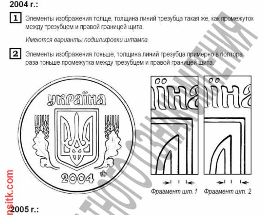 Как всегда, попробую определить разновидность штампа монеты, за классификацией каталога Коломийца. Всего описано 2 типа штампа лицевой стороны 5 копеек Украины 2004 года, и вариант на изображении выше, это штамп 1, где толщина линии трезубца такая же, как промежуток между трезубцем и правой границей щита.