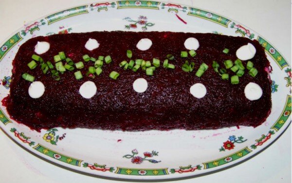 Главный секрет превращения селедки под шубой в селедку в шубе в том, как правильно измельчить овощи и избавить свёклу от лишнего сока. Заметно облегчает приготовление рулета бамбуковый коврик для суши. Состав традиционный: 400 г отварной свёклы, по 300 г отварной моркови и картофеля, 2 крупных яйца вкрутую, 4 ст. ложки домашнего майонеза, соль и 250 г филе сельди. Овощи отвариваю в мундире и в подсоленной воде. Измельчаю на мелкой терке. Каждый овощ и яйца отдельно, промывая терку при смене овощей. Первой тру свёклу, складываю ее на дуршлаг, выстеленный марлевой салфеткой. Пока занимаюсь остальными ингредиентами, часть сока уйдет. Селедку тщательно очищаю от косточек и рублю кубиками. Сразу скажу, что не очень люблю добавлять яйца в это блюдо, поверьте, и без них получается вкусное блюдо. Как только все готово, стелю на стол бамбуковый коврик, застилаю его пищевой пленкой (чтобы не пачкался да и работать так будет проще). Отжимаю сок свеклы, массу выстилаю на пленку, разравниваю сло