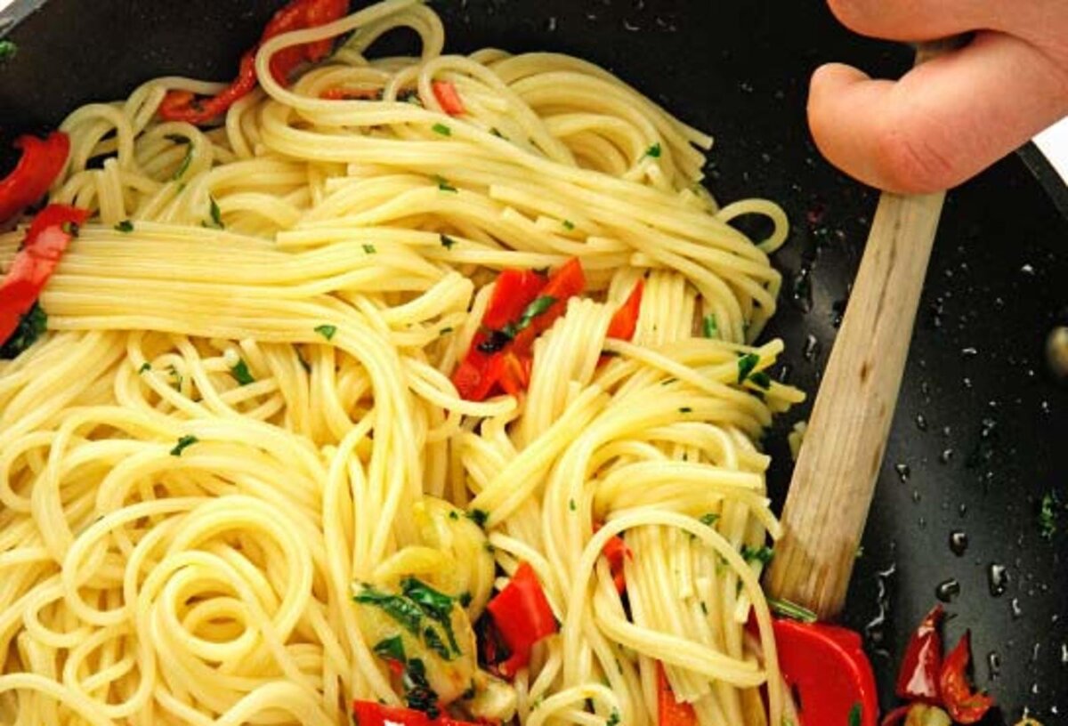 400 гр. спагетти 30 гр. оливкового масла 4 з.чеснока 1 перчик чили пучок петрушки Спагетти сварить. На оливковом масле обжарить нарезанный чеснок и перец чили. Слить воду , выложить спагетти на сковороду, перемешать и посыпать рубленой петрушкой. Если блюдо понравилось, подписывайтесь на мой канал, ставьте лайки. Вам все равно, а мне приятно, и я с удовольствием подготовлю для Вас новые вкусные рецепты. !!!!!!