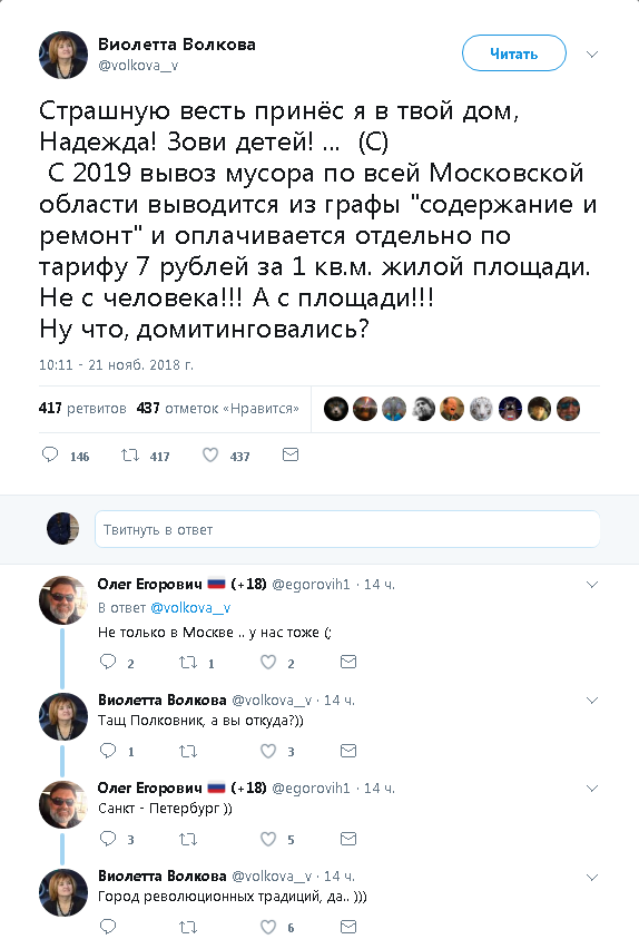Освещая две неоднозначные, но важные новости, и приняв решение о минимизации воды в информации, приведем вашему вниманию инфо-концетрат по освещаемой нами теме из мира внутруроссийского сюреалистичного политического представления театра абсурда в паре наиболее информативных твиттах. "Страшную весть принёс я в твой дом, Надежда! Зови детей! ... (С) С 2019 вывоз мусора по всей Московской области выводится из графы "содержание и ремонт" и оплачивается отдельно по тарифу 7 рублей за 1 кв.м. жилой площади. Не с человека!!! А с площади!!! Ну что, домитинговались?". Вы знаете сколько пыли с 1 кв.м.?!Это вам не шутки. А можно ещё с кубатуры квартиры например... Слева экс-губернатор Владимирской обл Орлова. Сегодня стала аудитором Счётной Палаты Справа Д.Хвостов, при губернаторе Орловой был её замом, получал от неё благодарности. Сегодня был осуждён на 11 лет за взятки в размере 20 млн руб Представьте, что она начудит в Счётной Палате виз аут коментс.., мы следим за ходом событий...