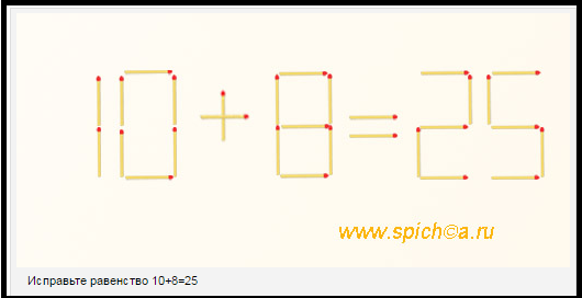 На картинке изображено уравнение из спичек, нужно убрать три спички так чтобы уравнение стало верным: Ну что какое уравнение у вас получилось? А вот ответ: Что бы получилось правильное равенство нужно у цифры 10 убрать три спички так чтобы получилась 17 и тогда получится верное уравнение: 17+8=25. Чтобы увидеть больше интересных картинок и головоломок не забывайте подписываться на наш канал и если вам понравилось ставьте лайки!! Спасибо что вы с нами!! Материал:www.spichca.ru