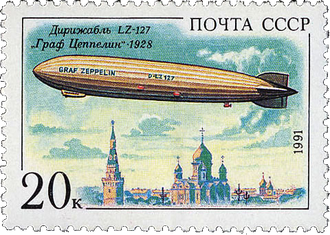 Следующая марка из серии «Дирижабли. 1991 год» натолкнула на размышления о том, что в любом деле не бывает мелочей, а спешка и показной энтузиазм зачастую только вредят делу. Это, в частности, подтверждает история почтовых марок, выпущенная в СССР к прилету LZ 127 в Москву в сентябре 1930 года.