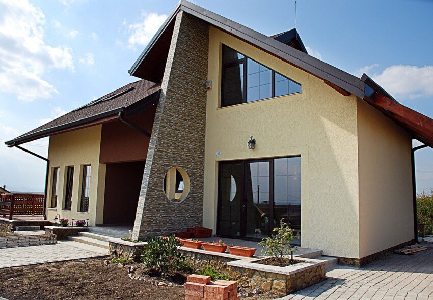 Большое количество современных частных домов строится из бетонных плит и блоков. Этот материал можно комбинировать с деревянным срубом и кирпичной кладкой. Многообразие материалов для облицовки открывает большие возможности для стильного внешнего оформления, с помощью которого можно улучшить тепло- и влагоизоляцию и прочность здания.