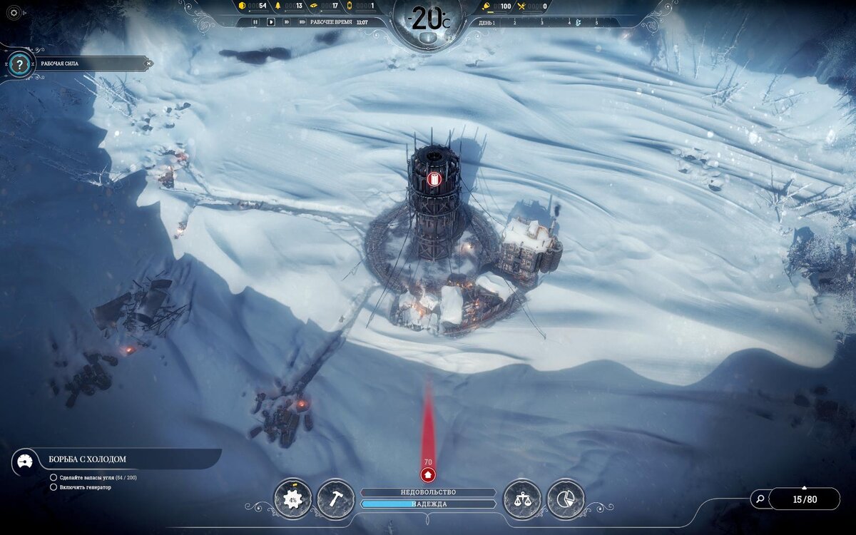 В прошлый раз вышло не удачно, народ помер, да и прогнали нас. Но мы получили опыт, пробуем заново. День 1 Сразу людей отправил за добычей угля, древесины и стали, построил палатку и мастерскую. В прошлый раз нам не хватало угля, и теперь в мастерской первым делом исследую угледобытчик. Также успел построить улицу и санитарный пункт. День 2 Построил кучу палаток, вроде пока без происшествий. День 3 Выдался очень насыщенным. Построил охотничью хижину и кухню. Проложил новую улицу, и начал строительство: лесопилки, угледобытчика и поста добычи. День 4 Всё достроилось, только для работы не хватает людей. Пришлось принять закон о детском труде, детей отправил работать на кухню и помогать на складе. Ещё проложил улицу до залежей железной руды, планирую там построить сталелитейный завод, правда я его ещё не изучил. День 5 Народ голодает, недовольство растёт. Решил построить ещё одну кухню и охотничью хижину. Также изучил обогреватели. Теперь можно включать дополнительный обогрев, чтобы